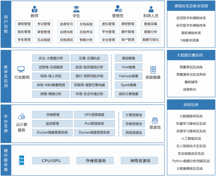 普開(kāi)數(shù)據(jù)針高校進(jìn)行了大數(shù)據(jù)教學(xué)管理、項(xiàng)目實(shí)踐、科研服務(wù)、創(chuàng)新孵化等實(shí)際應(yīng)用場(chǎng)景,大數(shù)據(jù)實(shí)驗(yàn)室提供穩(wěn)定、可靠、高效的軟硬一體化大數(shù)據(jù)教學(xué)科研環(huán)境,以及完善的課程體系、項(xiàng)目數(shù)據(jù)和視頻、多樣化的教學(xué)手段和豐富的實(shí)戰(zhàn)案例。