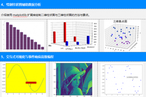 通過大量案例快速介紹Python運算符、表達式、內置函數,列表、元組、字典、集合,選擇結構與循環結構,函數定義與使用,字符串與正則表達式等內容。學習完這些基礎內容之后,重點學習文本文件操作、json文件操作、CSV文件操作、Word文件操作、Excel文件操作、網絡爬蟲原理與應用、numpy數組運算與矩陣運算、pandas數據分析、matplotlib數據可視化以及sklearn機器學習等方面的內容。
