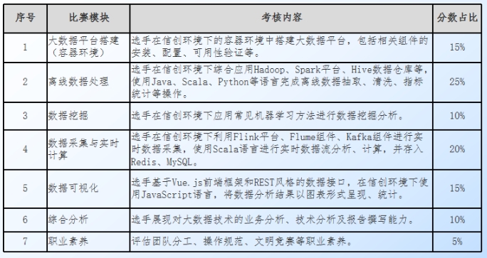 • 考核內容包括在容器環境中搭建大數據平臺、進行離線數據處理、數據挖掘、數據采集與實時計算、數據可視化以及綜合分析,旨在評估參賽者在信創技術環境下的綜合應用能力。