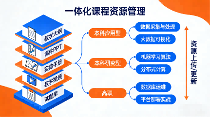 平臺打造完善的課程管理體系,實現課程資源的統一管理,涵蓋教學大綱、課件PPT、實驗手冊、配套視頻、鏡像資源、試題庫等核心教學素材。針對不同教學階段需求,平臺設置本科應用型、本科研究型、高職三大課程體系,每門課程均提供教學實驗指導手冊、在線視頻、資源包、實驗示例代碼等完整配套資源,既滿足河北東方學院不同層次的教學需求,又能支撐標準化人才培養。