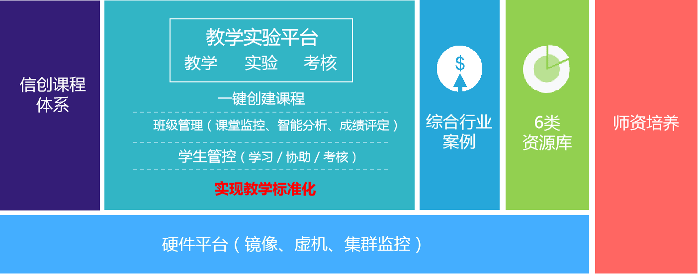 提供完善課程體系、在線學習系統,以信創課程學習、在線視頻、習題、線上測試、線上實驗為主線,典型案例貫穿知識點的學習模式,確保學生掌握信創項目技能。
